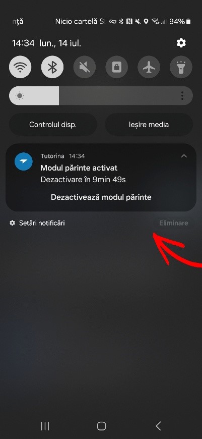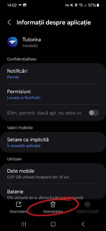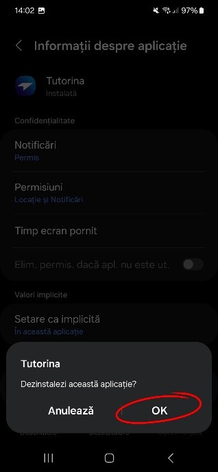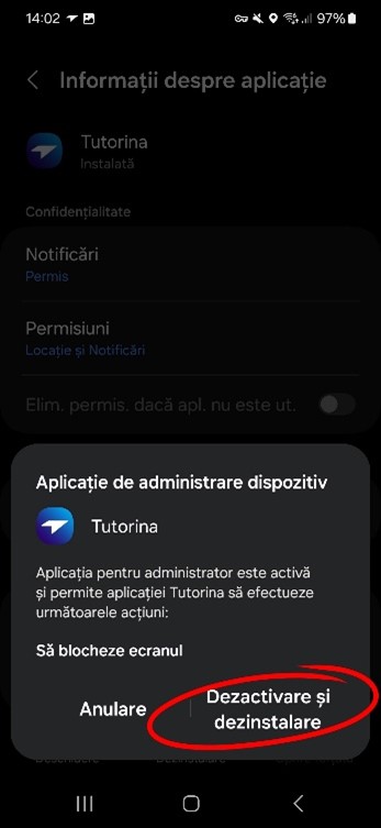 Dacă apare mesajul „Aplicație de administrare dispozitiv” Tutorina are permisiuni speciale (ex. blocarea ecranului). Apasă: „Dezactivare și dezinstalare” pentru a continua.